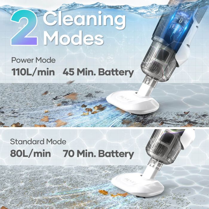 Nobeno čiščenje ni enako, zato Pilot H2 ponuja dva načina čiščenja. Standardni način: 80 LPM, ali za bolj zahtevna čiščenja, način Power: 110 LPM z izboljšanim sesanjem, filtracijo in močjo čiščenja. Vse to naredi Pilot H2 odličnega pomočnika vsakemu brezžičnemu robotskemu čistilcu bazena podjetja Aiper.
