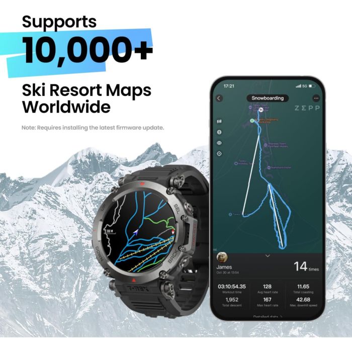 Ne glede na to, ali se odpravljate na alpsko smučanje ali tek na smučeh, se pogumno odpravite na smučišče, ki vzbuja vaš pustolovski duh z barvnimi zemljevidi, ki vas vodijo. Z natančnimi navodili za pohodniške poti in žičnice ti zimski zemljevidi spremenijo vaš Amazfit T-Rex Ultra v najboljšega spremljevalca pri smučanju.