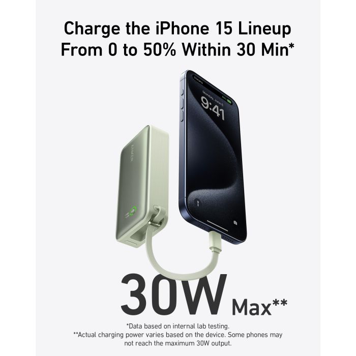 Dvosmerno polnjenje z močjo 30 W: napolnite power bank na 50 % v samo 45 minutah ali dosežete 50 % napolnjenost vašega iPhone 14 v 30 minutah s pomočjo 30 W dvosmernega hitrega polnjenja.