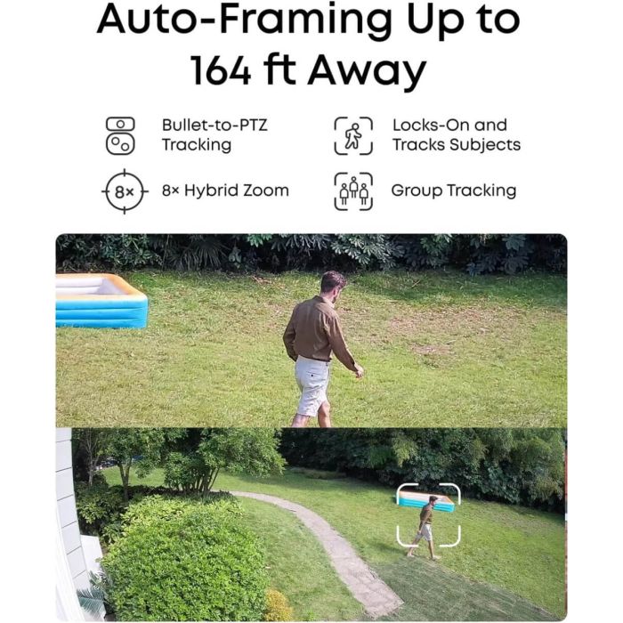 Samodejno kadriranje in sledenje skupinam Ko kamera zazna osebo, se PTZ zaklene nanjo in jo samodejno sledi z ostrimi bližnjimi posnetki do razdalje 50 m. Samodejna povečava ohranja subjekte v kadru, dokler ne zapustijo vidnega polja.
