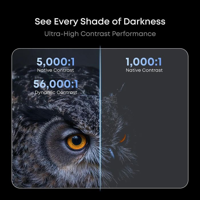 • Oglejte si vsako senco teme z ultra visokim kontrastom: 6-listna zaslonka omogoča naravno kontrastno razmerje 5.000 : 1, nadgrajeno s tehnologijo NebulaMaster, ki doseže impresivnih 56.000 : 1.