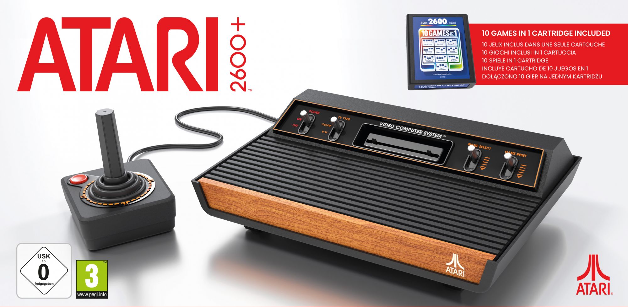 Atari 2600+ je zasnovan tako, da je videti in se obnaša kot Atari 2600 s štirimi stikali, ki je bil predstavljen leta 1980. Ta sodobna različica predvaja tudi igre Atari 7800, ima način širokega zaslona, se zlahka poveže s sodobnim televizorjem in vključuje igralno kaseto 10 v 1 s klasičnimi Atarijevimi naslovi. Priloženi krmilnik CX40+ Joystick Controller je poustvarjen v enaki velikosti in postavitvi kot originalni krmilnik 2600 Joystick Controller, zato lahko podoživite igralne izkušnje z začetka igranja video iger na domači konzoli.