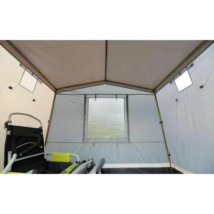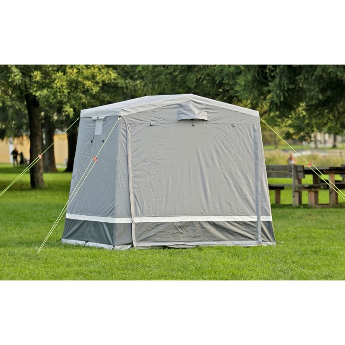Praktičen šotor za shranjevanje s sedežno streho za dobro opremljene avtodome. Robustno zasnovan s trdno všito podlogo. Velika vhodna vrata spredaj se lahko priročno odprejo z dvema zadrgama, po potrebi pa jih je mogoče odpreti kot streho proti soncu. Zadnja stena ima veliko mrežasto okno, ki ga je mogoče zapreti z reliefno folijo. Tri prezračevalne odprtine na sprednji in stranskih stenah zagotavljajo zadostno kroženje zraka v šotoru. Priložen je montažni material.