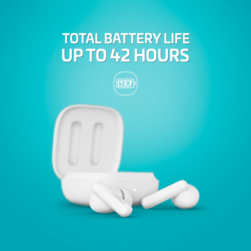 Zagotovite si 8 ur neprekinjenega predvajanja s slušalkami in dodatnih 34 ur iz polnilnega etuija. To je neverjetnih 42 ur neprekinjene glasbe, vključno s priročnim USB-C za polnjenje.