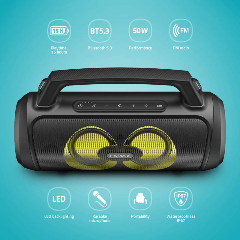 Nastavite ton za vsako zabavo s prenosnim zvočnikom LAMAX PartyGo1 Play. Njegovo majhno ohišje s priročnim ročajem skriva precejšnjo moč 50 W. Kjerkoli si ga zamislite, vam bo postregel z močnim, polnim in bogatim zvokom zahvaljujoč tehnologiji BeatBass®. Ne glede na to, ali gre za pravo zabavo ali peko na žaru na vrtu, jim bodo 3 načini LED osvetlitve ozadja in priloženi mikrofon vedno dali pravo vzdušje, s katerim lahko uživate v odličnih karaokah ali moderirate dogodek. Bluetooth 5.3 zagotavlja takojšnjo združitev zvočnika s katero koli napravo in zagotavlja prenos brez napak do 18 m, lahko pa ga povežete tudi prek USB, microSD ali AUX in ga lahko spremenite v power bank prek vhoda USB-A . V dobri glasbi lahko uživate tudi na poti, baterija zvočnika zdrži do 15 ur, zahvaljujoč praktičnemu traku pa ga lahko udobno nosite čez ramo. Če en zvočnik ne zadostuje, ga lahko priročno seznanite z drugim z uporabo tehnologije True Wireless. Nimate seznama predvajanja pri roki? Uporabite FM radio, ki ga lahko enostavno uglasite. Zvočnik podpira glasovne pomočnike in z njim lahko upravljate telefonske klice.