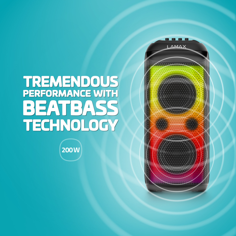 Pravo zabavo, peko na žaru, filmski večer s prijatelji ali preprosto sproščanje ob podcastu ali med telovadbo bo popeljal na povsem drugo raven zahvaljujoč zvočniku z močjo do 200 W. Spremljal vas bo kamorkoli želite, in njegovimi dvopasovnimi zvočniki ter podrobnimi vhodnimi nastavitvami s tehnologijo BeatBass® bodo vsaki skladbi zagotovili največjo moč in odličen zvok. Funkcija TWS (True Wireless Stereo) daje prostor za priključitev dodatnega zvočnika za resnično mega dogodek, ki ga nihče ne bo pozabil.