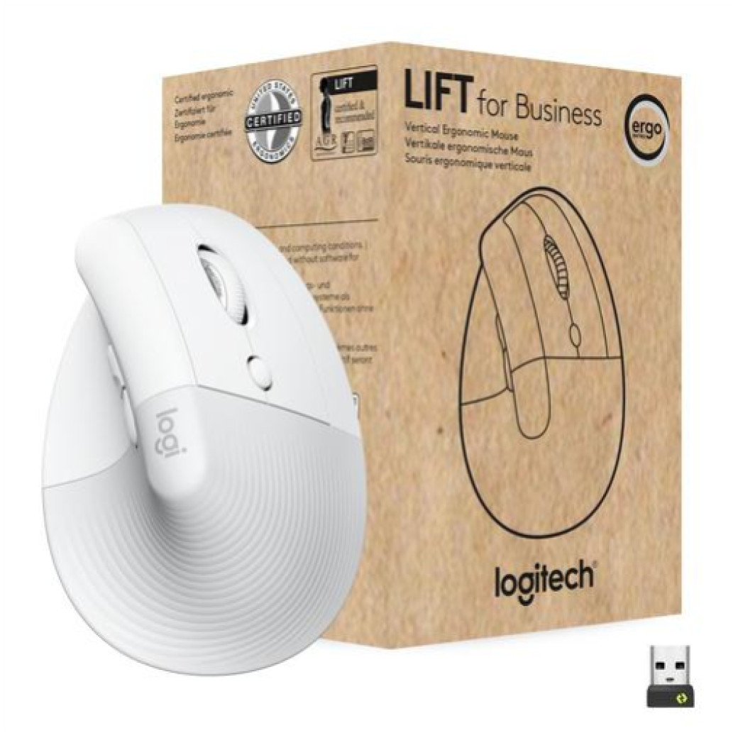 Logitech Lift For Business. Faktor oblike: desna, navpična različica. Tehnologija zaznavanja gibanja: Optični, Vmesnik naprave: RF Wireless + Bluetooth, Ločljivost gibanja: 4000 DPI, Vrsta gumba: Pritiskani gumbi, Število gumbov: 4, Vrsta drsenja: Kolesce. Vir energije: baterije. Barva izdelka: Bela.