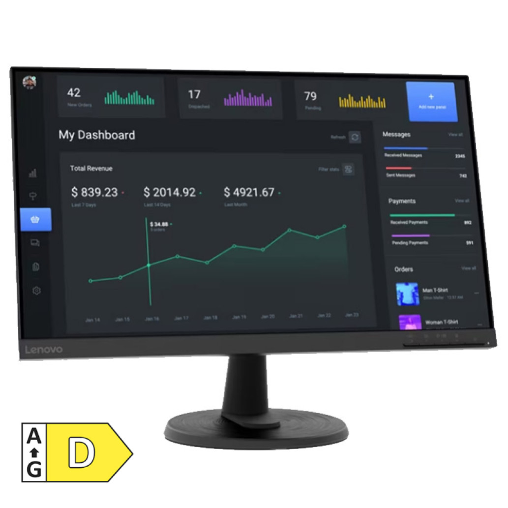 LENOVO D24-45 60,5cm (23,8″) FHD VA LED LCD monitor je, brezhibna izbira za vsakdanje pisarniško delo ali delo v domačem okolju. Opremljen je z zaslonom velikosti 60,5 cm (23,8″) s tehnologijo VA in ločljivostjo Full HD 1920 x 1080. Z odzivnostjo 4 ms na ekstremnem načinu ali normalnem načinu pri 6ms in 75 Hz hitrostjo osveževanja, boste dosegli hitrejše prikazovanje brez zamikov. Monitor omogoča dva priklopa: HDMI in VGA.