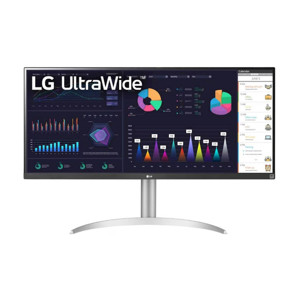 LG 34WQ650-W. Diagonala zaslona: 86,4 cm (34″), ločljivost zaslona: 2560 x 1080 slikovnih pik, vrsta HD: 4K Ultra HD, tehnologija zaslona: LCD, odzivni čas: 5 ms, izvorno razmerje stranic: 21:9, kot slike, vodoravno: 178 ° , Vidni kot, navpično: 178°. Vgrajeni zvočniki. Nosilec VESA, nastavitev višine. Barva izdelka: srebrna, bela.