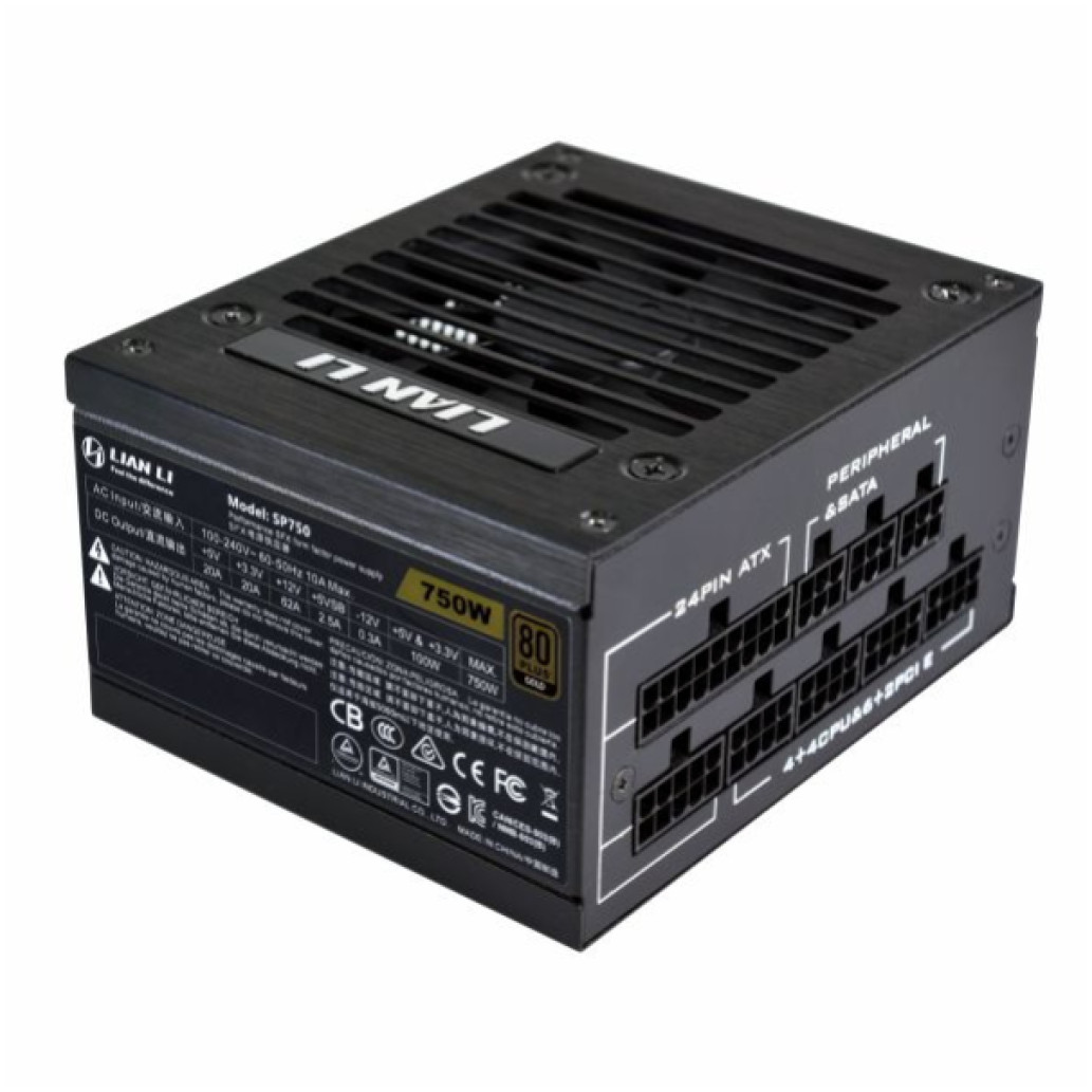 Lian Li SP750. Skupna moč: 750 W, AC vhodna napetost: 100 – 240 V, AC vhodna frekvenca: 50/60 Hz Vtič za matično ploščo: 20-polni ATX, dolžina napajalnega kabla matične plošče: 30 cm, dolžina napajalnega kabla SATA: 120 mm. Namen: osebni računalnik, napajalna enota (PSU) Faktor oblike: SFX, certifikat 80 Plus: 80 PLUS Gold. Barva izdelka: Črna. Širina: 63,5 mm Globina: 100 mm Višina: 125 mm