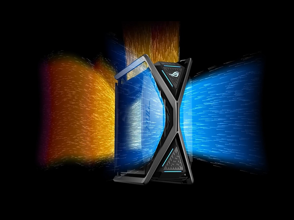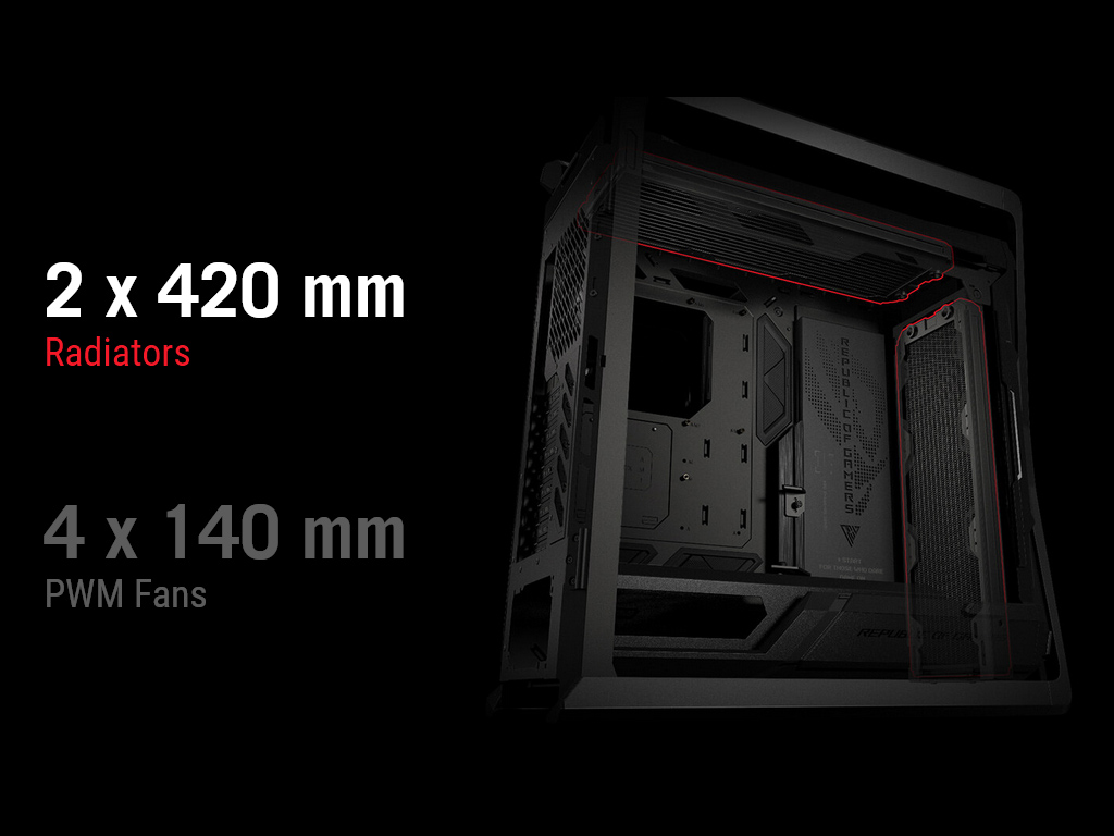 Hyperion ohišje je primerno za namestitev kompleksnih hladilnih sistemov. Opremljeno je s štirimi 140mm PWM ventilatorji, ki so povezani na ARGB hub, ki podpira Aura Sync sinhronizacijo.