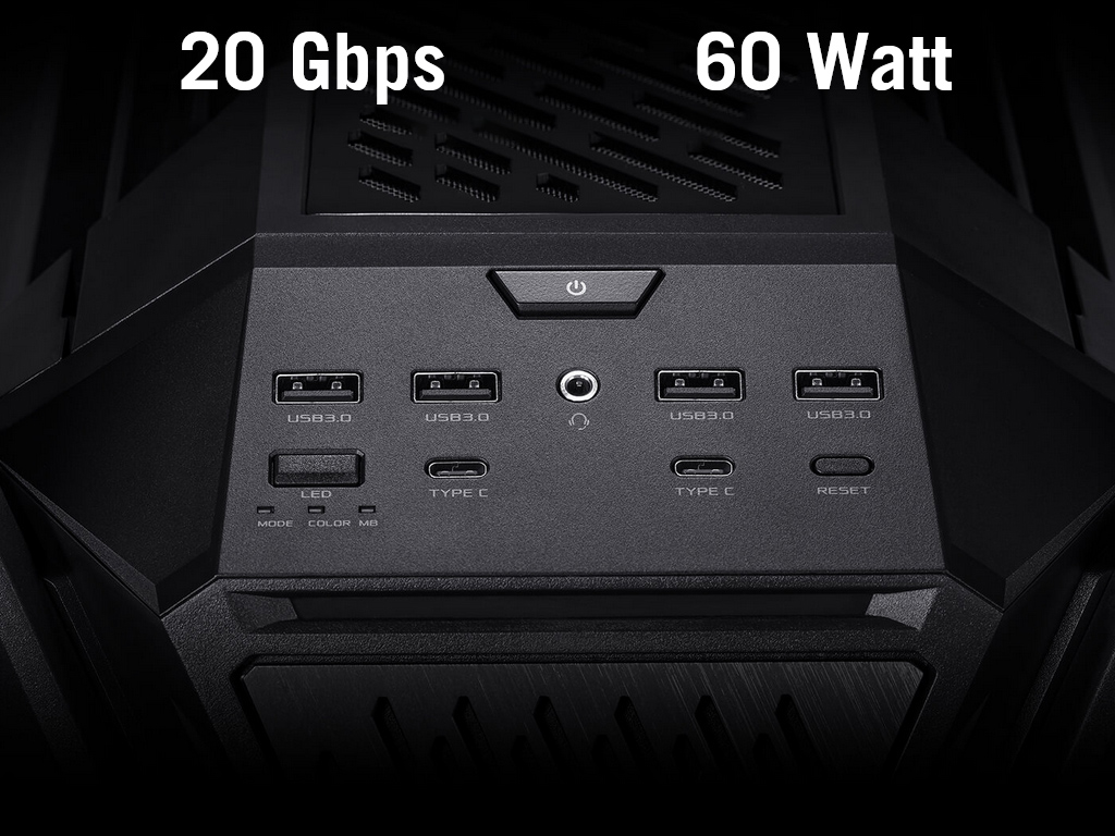Na prednji strani sta dva USB-C vhoda, ki omogočata polnjenje naprav do 60W. Močni ročaji na zgornji strani pa poskrbijo, da je ohišje enostavno za prijeti in prenašati, tudi ko je v njem sestavljen sistem.