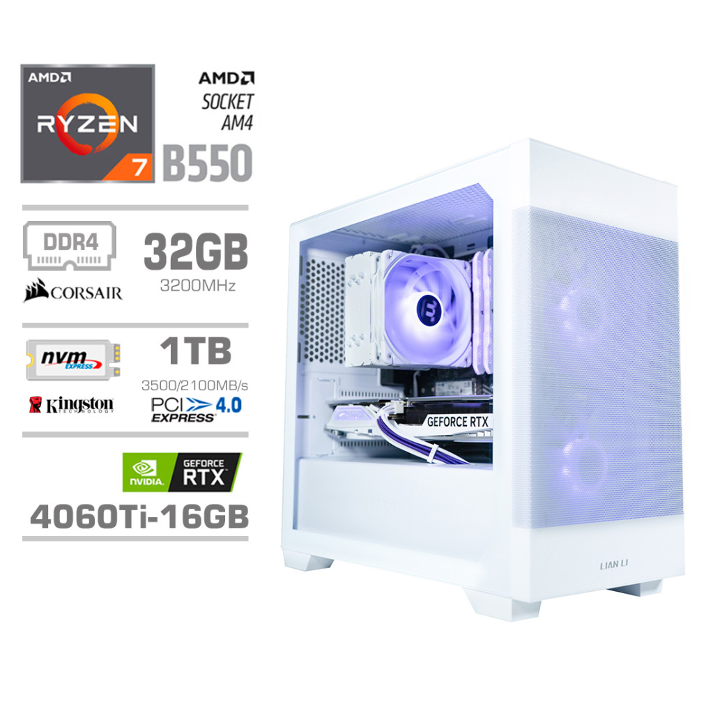 Računalnik MEGA MT S7X R7-5700X/RTX4060Ti-16GB/32GB/1TB-4.0/750W/Brez OS/bela RGB + Estetski napajalni kabli
