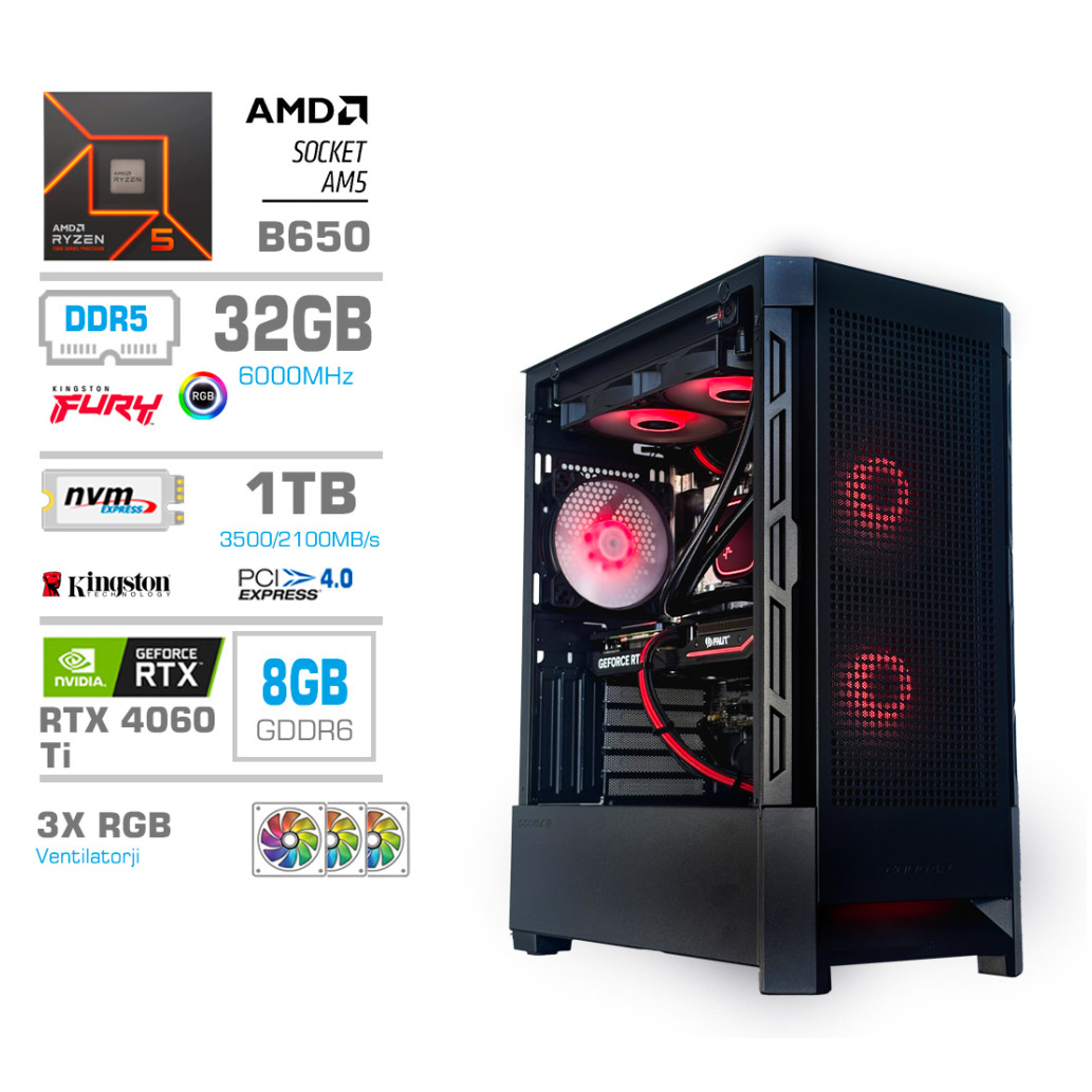 Računalnik MEGA MT S8 R5-7600X/RTX4060Ti/32GB-DDR5/1TB-4.0/750W/Brez OS/črna RGB + Estetski napajalni kabli [Rdeča / Črna]
