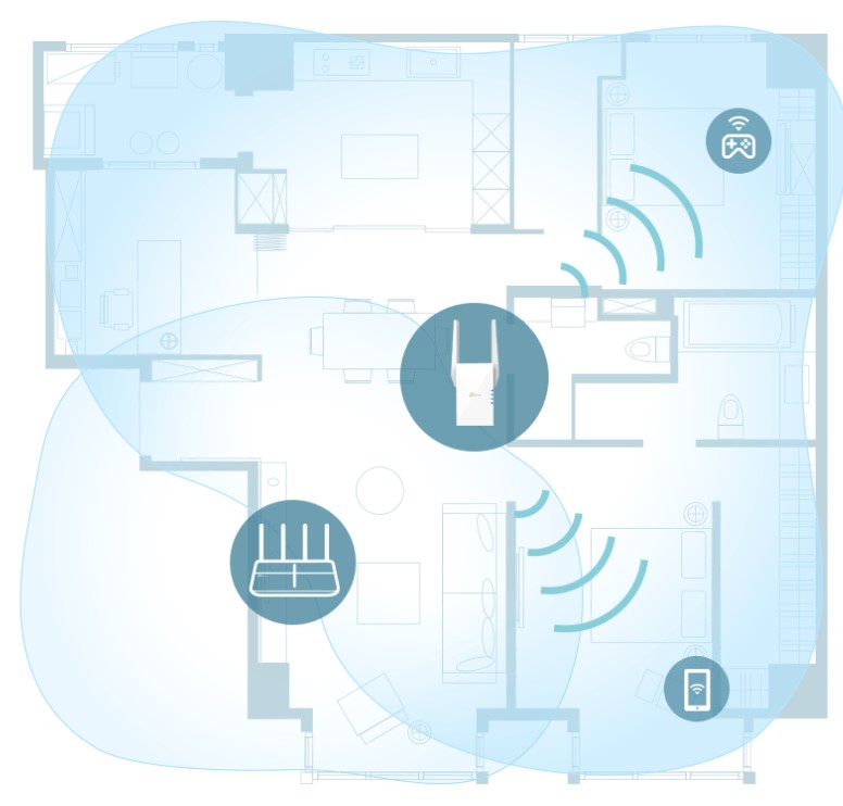 En usmerjevalnik ima omejeno pokritost WiFi in vedno povzroči mrtve cone WiFi. RE605X se brezžično poveže z vašim obstoječim usmerjevalnikom in poveča več signalov WiFi po vsem vašem domu, kar vam omogoča, da uživate v nemotenih omrežnih izkušnjah WiFi 6 povsod z veliko hitrostjo, zmogljivostjo in pokritostjo.
