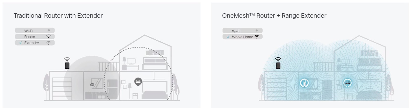 OneMesh je preprost način za oblikovanje omrežja Mesh z enim imenom WiFi za brezhibno pokritost celotnega doma. Samo povežite OneMesh ojačevalec na usmerjevalnik OneMesh.
