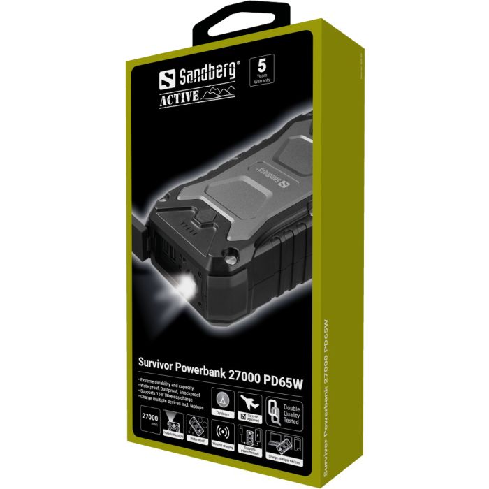 Prenosna baterija Sandberg Survivor Powerbank 27000 PD65W je popolna rezervna baterija za polnjenje mobilnih telefonov, prenosnih računalnikov in ostalih mobilnih naprav. Prenosna baterija se nahaja v robustnem ohišju, zaščitenemu v skladu s standardom IP66, zato lahko prenese zares grobo rokovanje. Je popolnoma odporna na vodo, udarce in prah, zato jo lahko vzamete s sabo skoraj povsod. Ima 2 močne USB izhode, vključno z izhodom QC 3.0 z zmogljivostjo do 18W. Ima tudi priključek USB-C za polnjenje USB-C naprav do 65 W, kar predstavlja zadostno moč za skoraj vse modele prenosnih računalnikov. Na zadnji strani se nahaja močna svetilka z nič manj kot 120 lumen lučkami LED.