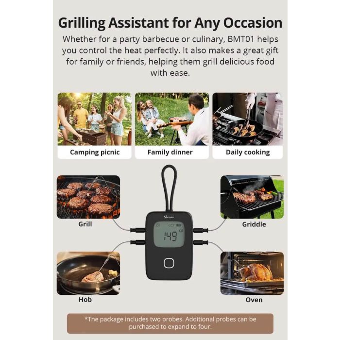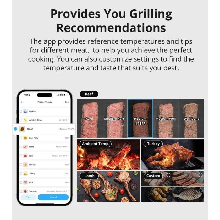 Aplikacija ponuja referenčne temperature in nasvete za različne vrste mesa (govedina, jagnjetina, perutnina, ribe, klobase …). Nastavitve lahko tudi prilagodite po meri za popoln okus.