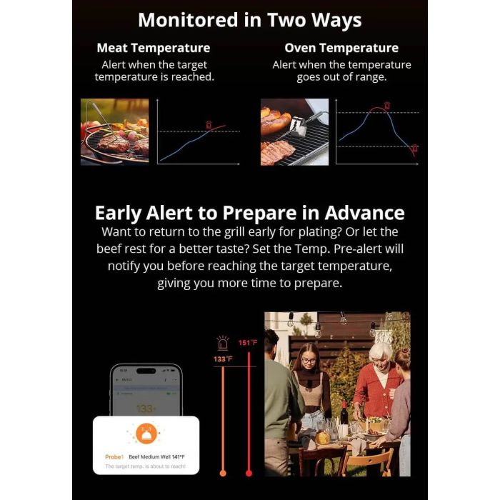 Nastavite želeno temperaturo hrane. Ko jo termometer zazna, naprava in telefon sprožita alarm, da se vrnete k žaru in odstranite hrano pravočasno.