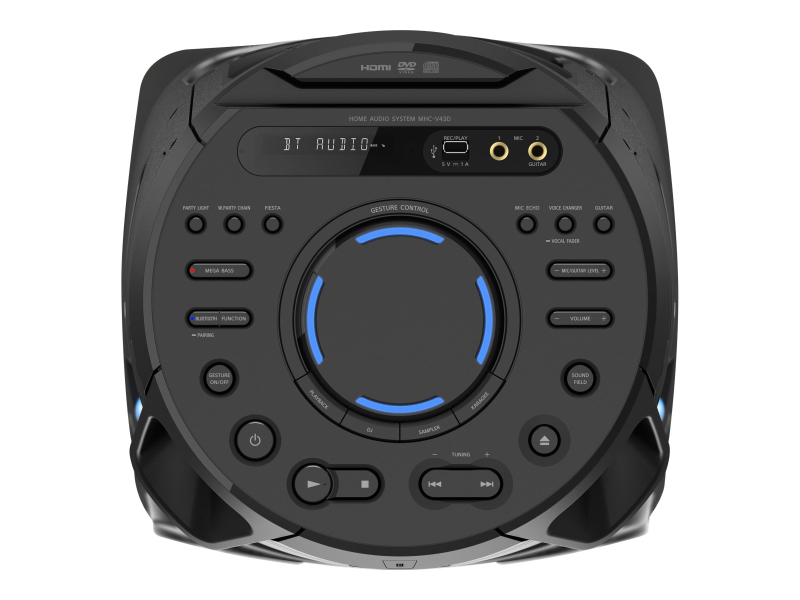 Z zamahom roke navpično ali vodoravno lahko preskočite skladbo, zamenjate učinek flanger z učinkom WAH, vklopite mikrofon za karaoke, nadzirate glasnost mikrofona in povišate glasnost. S kretnjami hitro in enostavno upravljate funkcije zvočnika MHC-V43D ter poskrbite za pravo razpoloženje na zabavi.