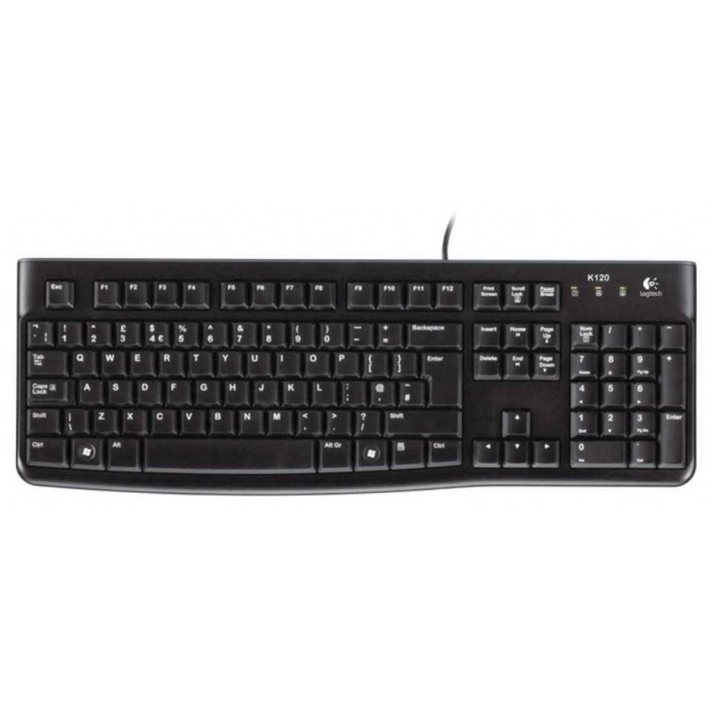 Logitech K120. Faktor oblike tipkovnice: polna velikost (100%). Stil tipkovnice: ravna. Vmesnik naprave: USB. Dolžina kabla: 1,5 m. Priporočena uporaba: univerzalna. Barva izdelka: črna. Odporna proti manjšim količinam razlitih tekočin.