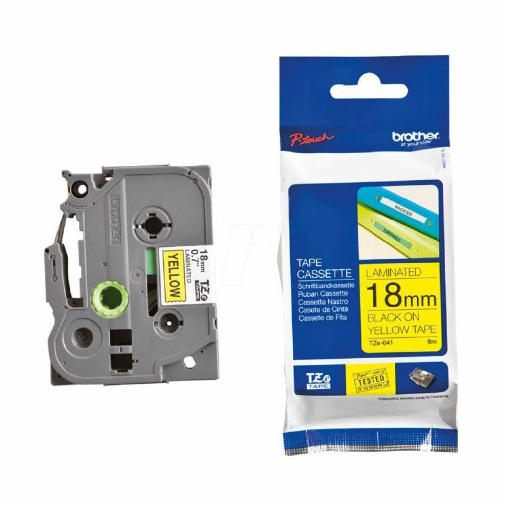 Kakovostni laminiran TZe Brother trak, širine 18mm in skupne dolžine 8m. Trak je rumene barve in omogoča potisk v črni barvi…