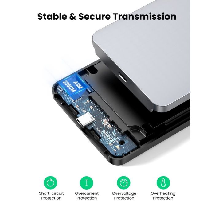 Ohišje trdega diska vsebuje najnovejša vrata USB-C 3.1 Gen 2, ki podpirajo hitrost prenosa podatkov 10 Gbps (7 + 15) Pin SATA III podpira največ 6Gbps prenos podatkov. Okrepljeno s pospešenimi protokoli za prenos – UASP (USB Attached SCSI Protocol) in TRIM omogoča, da ohišje trdega diska v celoti izkoristiti prednosti pogonov SSD.