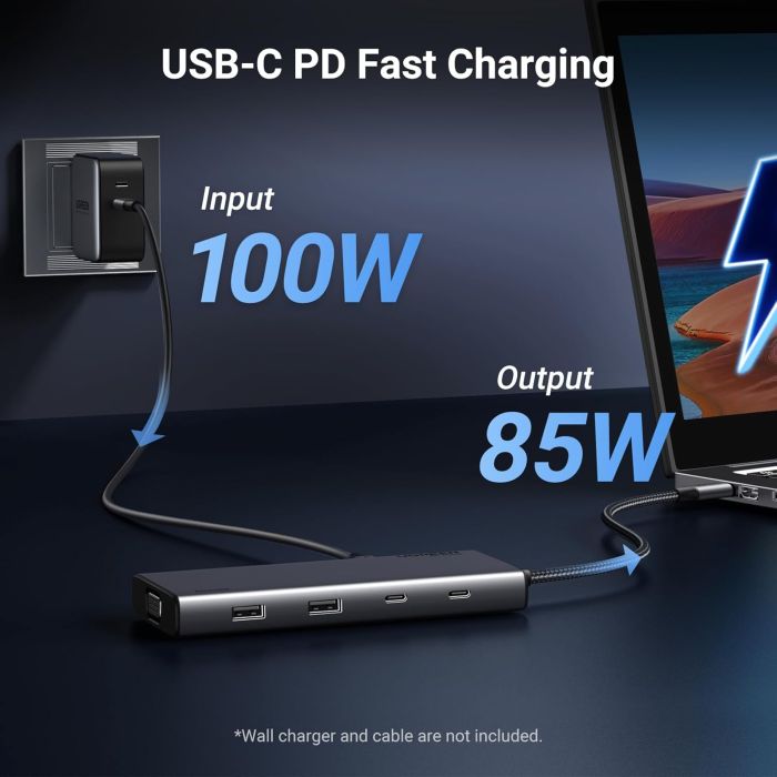 priklopna postaja tipa c ponuja do 85 W prehodnega polnjenja USB-C prek vrat PD, kar zagotavlja, da vaš prenosnik ostane popolnoma napolnjen, medtem ko rezervira 15 W za brezhibno delovanje drugih vrat. Uživajte v udobju zasnovanega polnjenja visoke moči. Upoštevajte, da so polnilna vrata Type-C PD združljiva samo z napravami, opremljenimi s PD