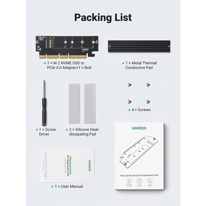 1 x adapter M.2 NVMe v PCIe s hladilnikom, 2 x silikonske blazinice za odvajanje toplote, 4 x vijaki, 1 x izvijač.