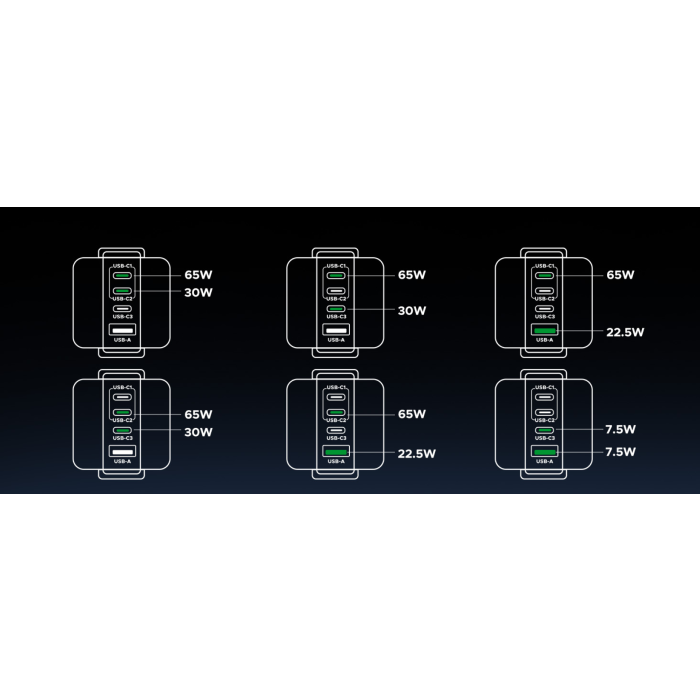 3 priključki USB-C in 1 priključki USB-A zagotavljajo do 100 W za telefone, tablice, prenosnike in drugo, vse hkrati s hitrim polnjenjem.