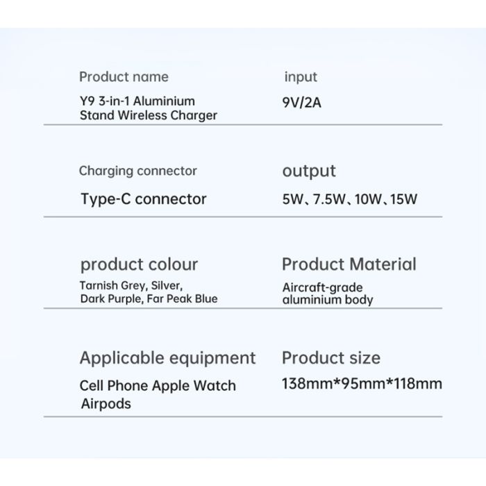 Večnamenski brezžična polnilna postaja Veger Y9 omogoča polnjenje treh naprav hkrati ali popolnoma ločeno in je primeren za brezžično polnjenje pametnih telefonov, Airpodov in Apple Watch.